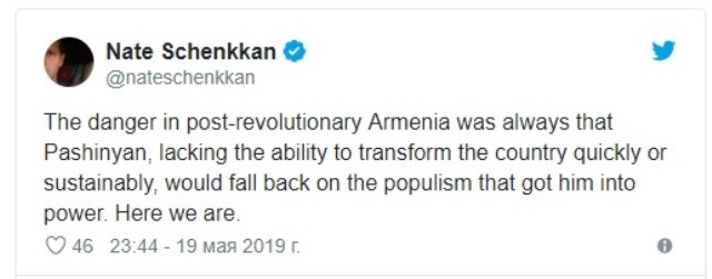«Հետհեղափոխական Հայաստանում մշտապես վտանգն այն էր, որ Փաշինյանը, չկարողանալով երկիրն արագորեն և կայուն ձևով վերափոխել, դարձյալ կվերադառնա պոպուլիզմին, որը նրան հասցրեց իշխանության։ Ահա և այստեղ ենք»,-թվիթերյան էջում գրել է նա։