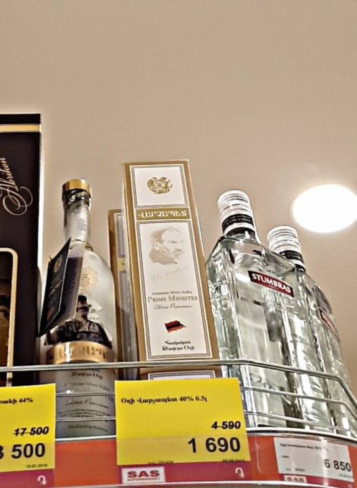 Այսպես․ «Վարչապետ» գրությամբ ու Փաշինյանի նկարով մի տեսակի օղին, որն արժեր 3․670 դրամ, այժմ վաճառվում է 1230-ով։ Մյուսը՝ ավելի գեղեցիկ փաթեթավորմամբ, 4․590-ից դարձել է 1690 դրամ։