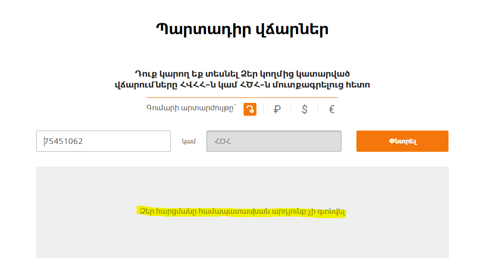 Գրությամբ խնդրարկված՝ վճարված հարկերի վերաբերյալ, տեղեկացնում եմ, որ տնտեսվարող սուբյեկտի կողմից պետական հաշվառման օրվանից հարկային պարտավորությունների վճարման վերջնաժամկետը դեռ չի լրացել՝ պայմանավորված անհատ ձեռնարկատիրոջ կողմից հարկման հատուկ համակարգում գործունեություն իրականացնելով»: