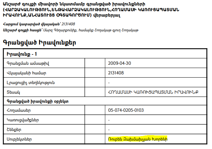 Բացի այդ, Կադաստրի պետական կոմիտեից տվյալներից պարզ է դառնում,որ այդ տարածքը 2009 թվականից պատկանում է Ռուբեն Չախմախչյանին: