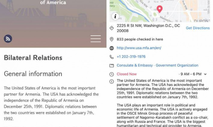 Հրապարակը գրում է. ԱՄՆ-ում Հայաստանի դեսպանության պաշտոնական կայքէջում, ինչպես նաև ֆեյսբուքյան պաշտոնական էջում սևով ապիտակի վրա գրված է, որ ԱՄՆ-ն Հայաստանի կարևորագույն գործընկերն է: Ոչ թե կարեւոր գործընկերներից մեկը, այլ հենց կարեւորագույնը: Այսինքն` Ռուսաստանը չէ մեր ռազմավարական գործընկերը, Իրանը չէ, Վրաստանն ու Ֆրանսիան էլ չեն, հենց ԱՄՆ-ն է: Նման խայտառակ ձևակերպումը, իհարկե, կամ ոչ կոմպետենտության հետեւանք է, կամ էլ հատուկ արված սադրանք` Ռուսաստանին և Իրանի նկատմամբ: Երկու դեպքում էլ սա դիվանագիտական սկանդալ է: ԱԳՆ մեր աղբյուրների փոխանցմամբ էջի ադմինիստրացիայով զբաղվում է հենց դեսպանությունը և նման ձևակերպումը հենց դեսպանությունն է տվել: