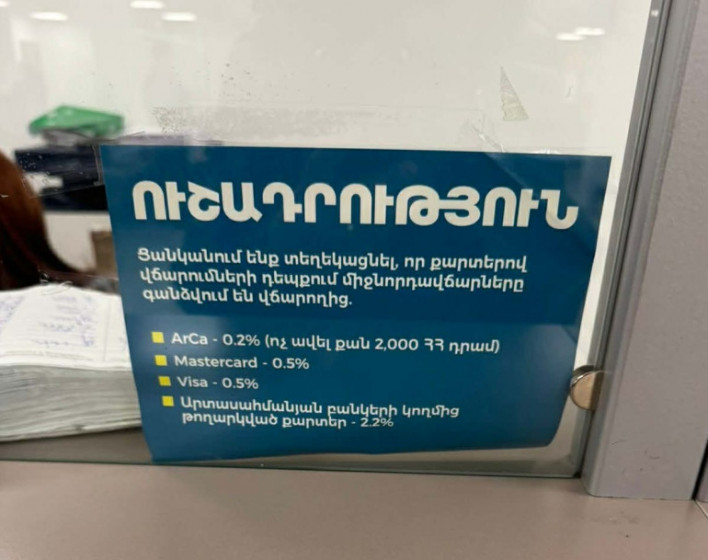 «Դա շատ տարածված պրակտիկա է. քեշով ավելի էժան է, քան քարտով վճարման դեպքում։ Ասեմ ավելին՝ դա տարածված պրակտիկա է նույն պետական հիմնարկներում։ Օրինակ, սա Նիկոլի զավթած նստավայրից մի քանի մետր այն կողմ գտնվող Բուզանդի վրայի Կադաստրի կոմիտեի դրամարկղի պատուհանին է փակցված։ Հպա՜րտ քաղաքացիները, անկանխիկ վճարման դեպքում, իրենք պետք է վճարեն միջնորդավճարները։ Սա այն կադաստրն է, որտեղ մեկ թուղթ փոխելն արժե 50,000-60,000 դրամ։ Բյուջե են լցնում, ձեռի հետ էլ տոկոսները թողնում հպա՜րտ քաղաքացիների ուսերին։