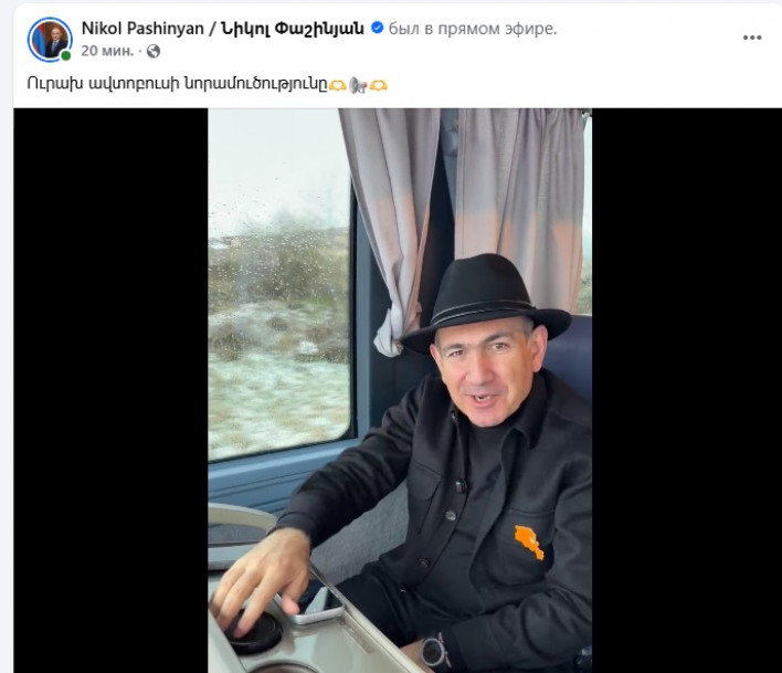 «Փաշինյանին անվտանգության համար ճամփա ընկած ոստիկանական ավտոբուսը վթարի է ենթարկվել՝ կա մեկ զոհ և 12 վիրավոր։ Այս լուրը տարածվելուց մեկ ժամ անց Փաշինյանը լայն ժպիտով տեսանյութ է հրապարակում և խոսում իր ձևակերպմամբ «ուրախ ավտոբուսի» նորամուծության մասին։