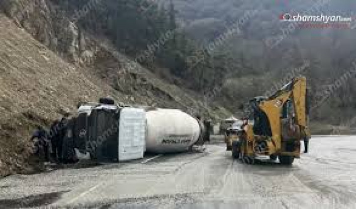 Դիլիջանի ոլորաններում բետոնախառնիչը բախվել է հողաթմբին և կողաշրջված հայտնվել երթևեկելի գոտում
